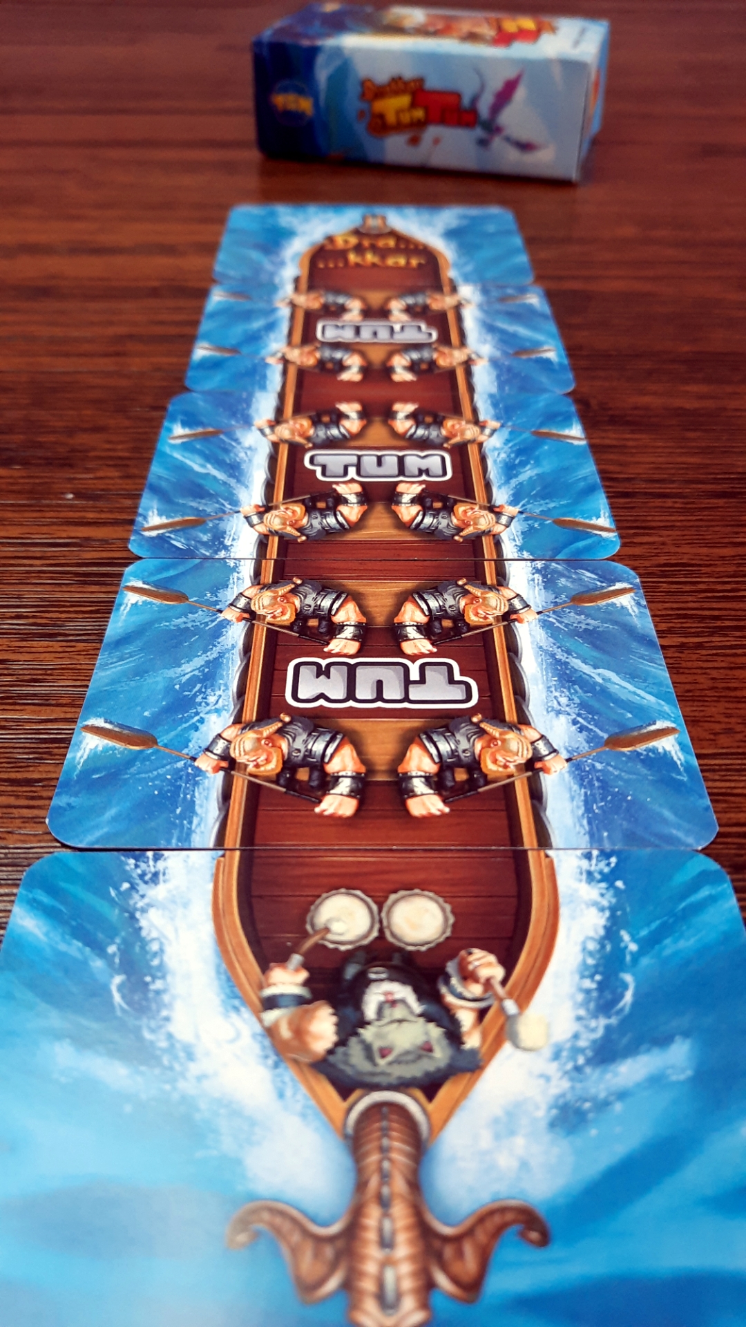 Quando o último TUM é cantado o jogador da vez joga uma das suas cartas em uma das sessões do barco e compra uma nova.