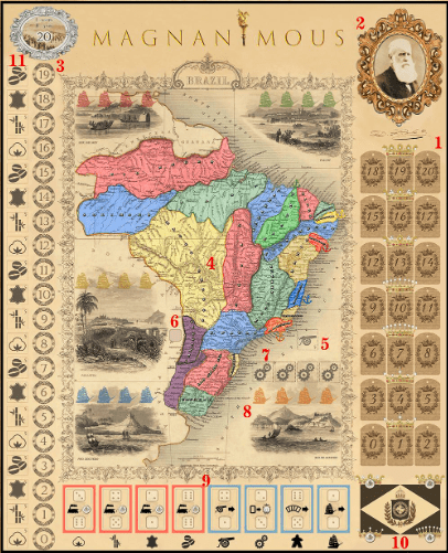 Magnanimous, um jogo do designer Caetano Foschini que entra em financiamento coletivo dia 13 de Maio onde cada jogador assume o papel de um barão no Brasil da monarquia, buscando influenciar na economia, crescer na nobreza, trabalhar para a declaração da República e lutar em conjunto com os demais jogadores na guerra do Paraguai.