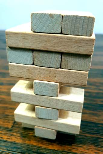 Uma maneira rápida de derrubar uma torre no JENGA é remover as duas peças laterais de um andar, deixando apenas a peça do meio sustentando o restante da estrutura superior.