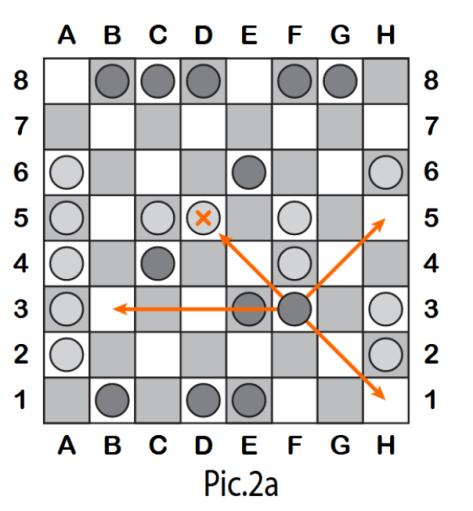 A peça em 3F pode movimentar-se 4 espaços (não menos) parando em 3B porque existem 4 peças naquela linha ou mover-se 2 espaços para 5D ou 1H na diagonal pois existem 2 peças nessa diagonal (existem outras possibilidades de movimentos que não detalhei aqui).