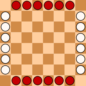 Cada jogador começa com 12 peças, sendo 6 em cada uma das laterais do tabuleiro.