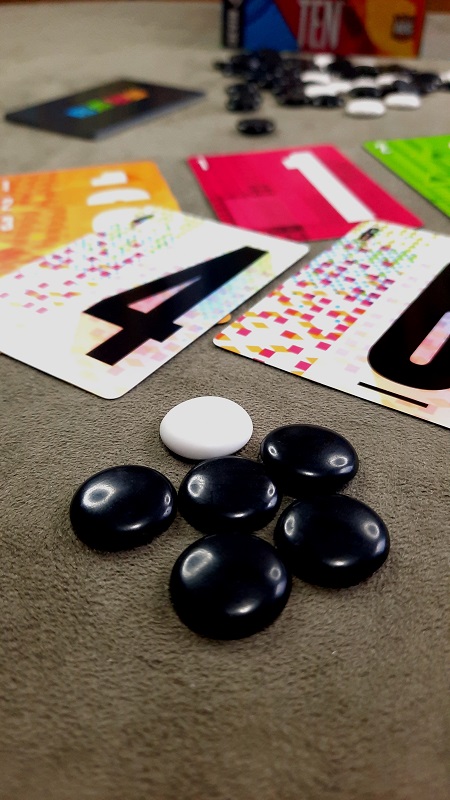 Na sua vez você vai revelar cartas do baralho e não pode ultrapassar o valor de DEZ (por isso que o jogo chama-se TEN), e essa soma de DEZ é referente às cartas de números e também das cartas de fichas.
