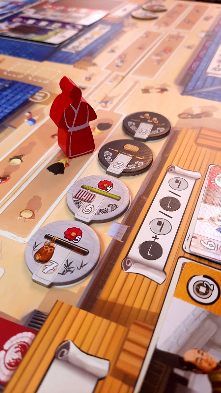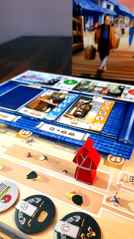 Mas antes de sair andando por ai você vai decidir entre receber grana ou comprar uma carta de personagem para posicionar em um dos espaços no tabuleiro central e colocar ali um dos seus bonecos (kobuns) e colocar nele indicando que aquele personagem é seu.