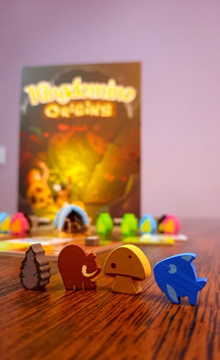 Kingdomino Origins é um jogo da família Kingdomino (você pode ler minha resenha sobre ele aqui) onde você posiciona peças ao estilo dominó para formar grupos e pontuar de acordo como tamanho deles.