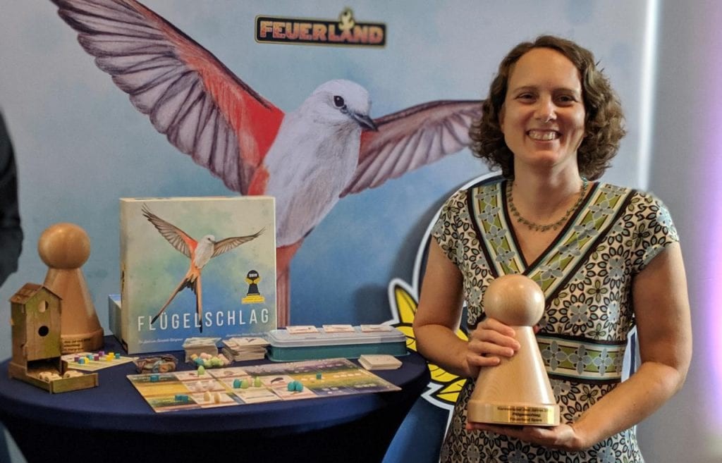 Da designer Elizabeth Hargrave, Wingspan chama a atenção de cara pela produção belíssima e capricho em cada componente como os ovos, o comedouro que serve como torre para rolar os dados entre outras coisas.