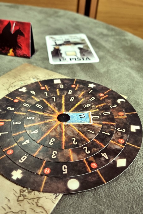 Quando os jogadores acham que resolveram o enigma proposto eles alinham o disco de acordo com os símbolos que eles encontraram na resolução e o disco indica qual carta de solução deve ser lida.